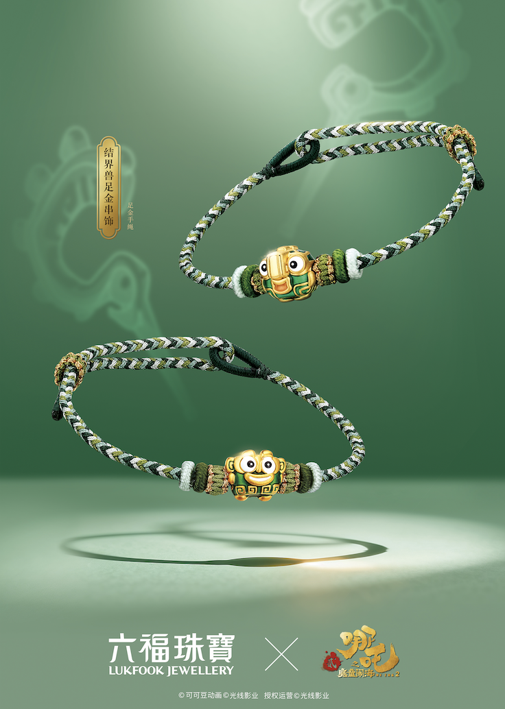 作为电影《哪吒之魔童闹海》里的“喜剧担当”,萌趣结界兽将无形的守护具象化。以鎏彩点睛一对青铜形象结界兽足金串饰,憨态呆萌的斗嘴形象即刻跃于眼前,并将绿意融入绳纹,宛如结界兽在腕间形影不离,轻声低语,寄以平安顺遂、守护安康的祝愿。